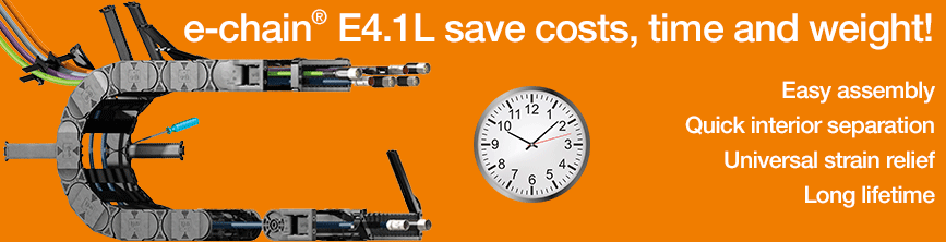 "Allrounder" e-chains® and e-tubes for high dynamics. The E4.1L series has been developed to combine the advantages of the E2/000 and E4.1 in one series. The strength and stability of the E4.1 system combined with the easy accessibility of the E2/000 system. The E4.1L system is the ideal energy chain for mechanical engineering and applications of all kinds where there must be an optimum relationship between technical requirements and economic efficiency.