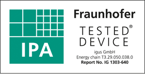 Extremely low noise - System T3 tests in the igus® lab showed at 1 m measuring intervals: a value of ≈ 33 dB(A) at 26.5 dB(A) basic sound level for Series T3.29.050.038