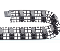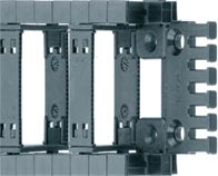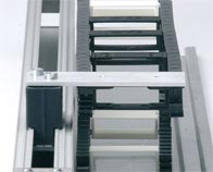 T3 System combines low-noise operation, low sound level, simple installation and cost effectiveness. The side plates that can be plugged into each other replace the conventional pin/hole connection and prevent relative movements between the joints. For this reason, an almost complete freedom from wear is attained (clean room). The geometry of the T profile ensures that almost no polygon effect is generated during the filling of the e-chain®. The T band operates very harmoniously and round, and has extremely low vibration and noise In order to reduce the manufacturing and assembly costs, the T-profile is mounted not individually, but - similar to the igus® E3 System - in a length of 8 chain links. Due to its low weight the igus® T-Band is suitable for applications with rather low fill weights and short strokes, combined with high accelerations and speeds.