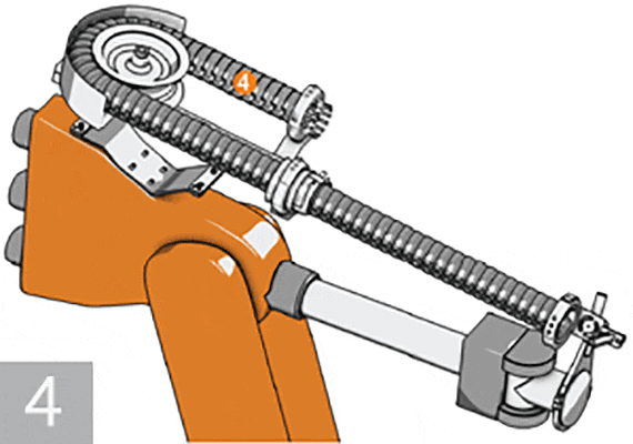 The ideal retraction force adjustment is made by filling the triflex® R with cables and hoses and by guiding the robot downward with axis 6 in a vertical position. Increase the air pressure using the pressure regulator such that