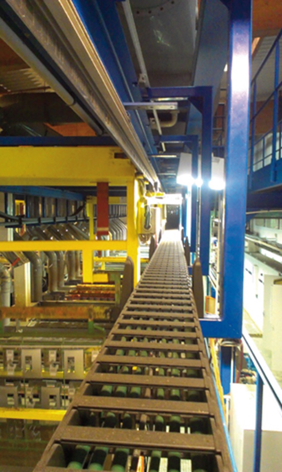 Six transport trolleys move material through the individual stations in this galvanization plant. Until today they were equipped with towing and ribbon cables that are mounted to ball-beared transport rolls and guided in a galvanized profil rail. Transport rolls and the profil rail were susceptible to faults and caused noise while the trolleys travel. Such expensive faults could be eliminated by using the corrosion-resistant e-chain® from igus®. The system operates very silent now.
